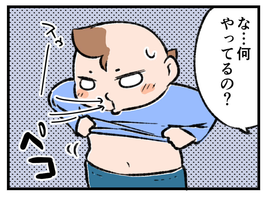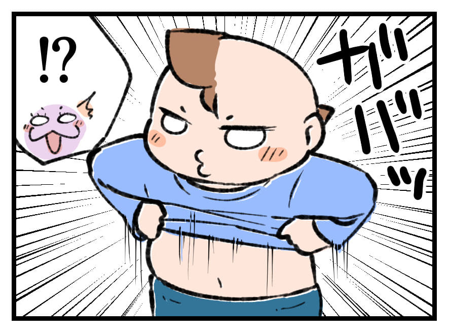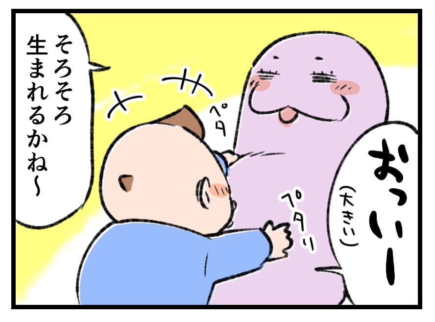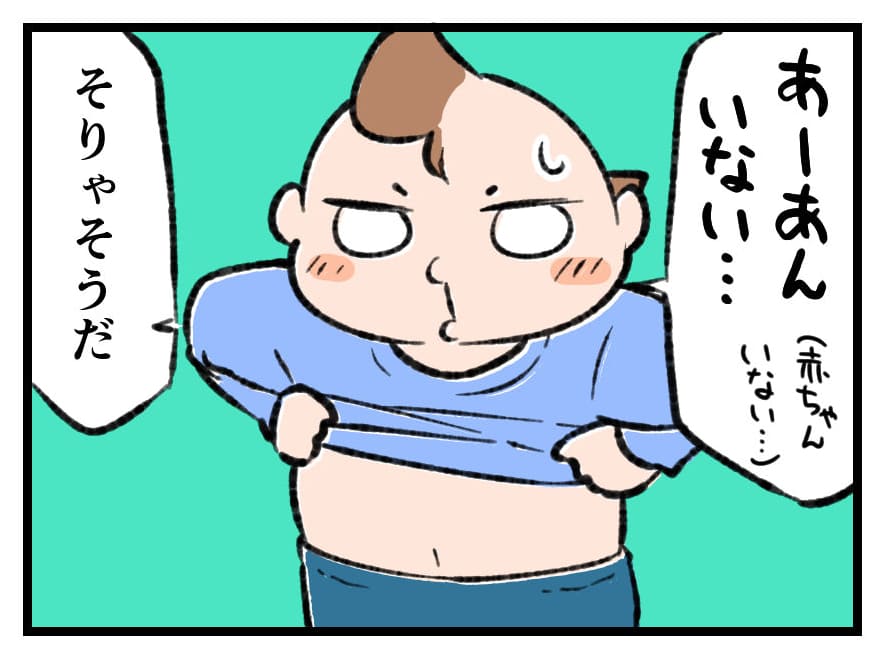 お母さんの大きなお腹を見て、なぜか自分にもいるんじゃないかと思った様子。
