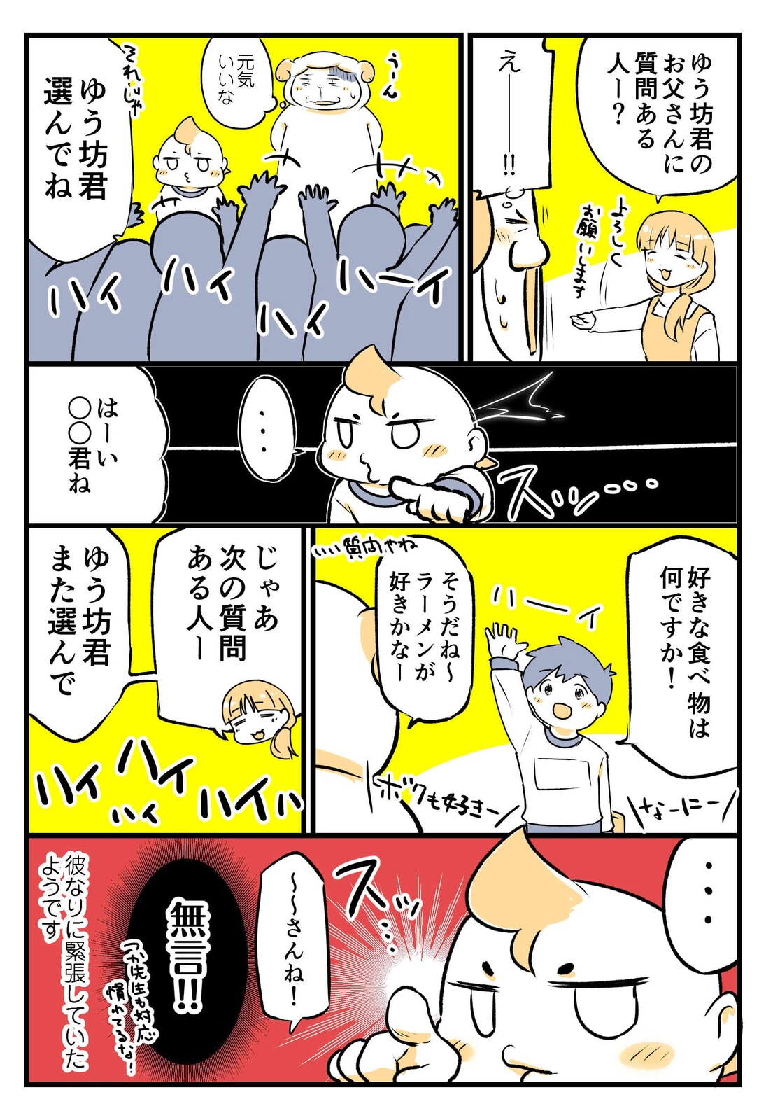 2023年02月28日 お父さん、幼稚園授業参観に行く④ 君に決めた!※無言 カテゴリ:4歳育児 お父さん、幼稚園授業参観へ行くの続きです!前回のはこちらから↓ 園児たちの前に呼ばれたお父さん…一体どうなってしまうのか😅直前まで騒がしかったものの皆の前に立って大人しくなったゆう坊君。実は結構緊張していたっぽいです😂しかしまあ幼稚園児は元気ですね。皆めっちゃ手を上げてくれました。恐怖の質問コーナーは次回に続きます! 当ブログの人気シリーズ現在療育通い中のゆう坊の言葉の遅れなどまとめました。↓ランキングに参加してます!一日一回押していただけると順位が動きます😚 タグ :#子育てマンガ#育児#長男4歳#幼稚園#1ページ#お父さん 「4歳」カテゴリの最新記事 コメント コメントフォーム 名前 コメント 記事の評価 リセット リセット 顔 星 情報を記憶 コメントを投稿する 小田急ロマンスカーミュージアムに行ってきました!お父さん、幼稚園授業参観に行く⑤ お父さんの〇〇は?
