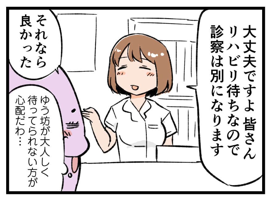 実際5〜6人待ちだったものの診察とリハビリは別扱いだったようで二番目の呼び出しで済んだ様子。