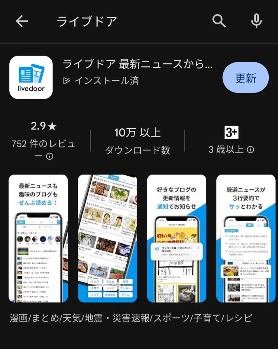 GooglePlay、AppStoreから「ライブドア」で検索し、アプリをインストール。