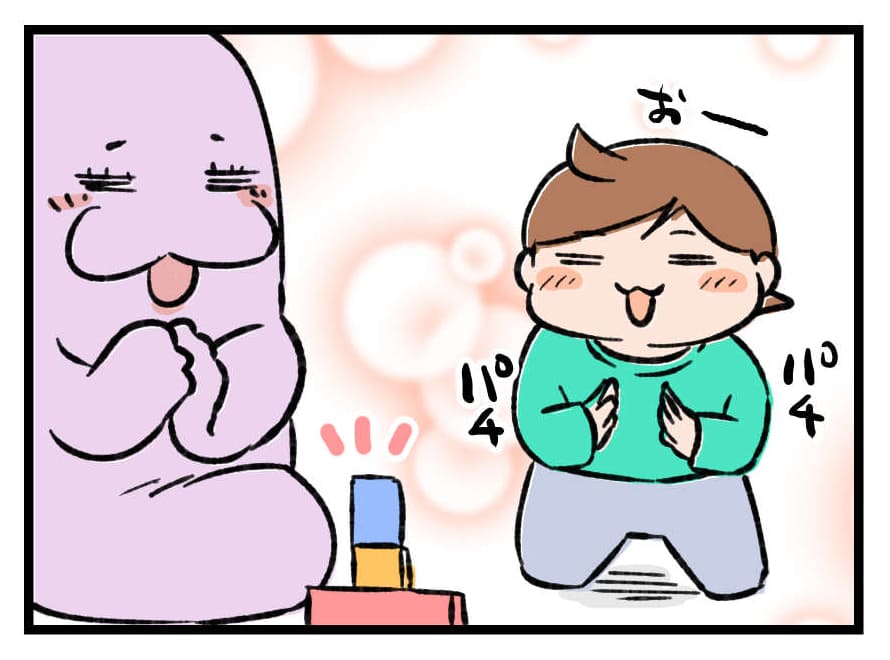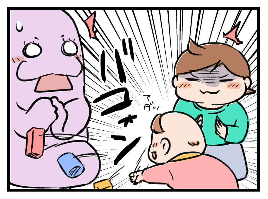 積み木をもっと小さい赤ちゃんに崩されて泣くor怒るかと思いきや…。