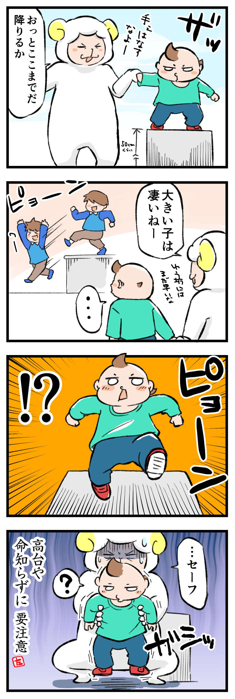 今までは50cmくらいの高いところから自力では降りられなかったんですが、5,6歳くらいの子が飛び降りてるを見て学習したのか…。
